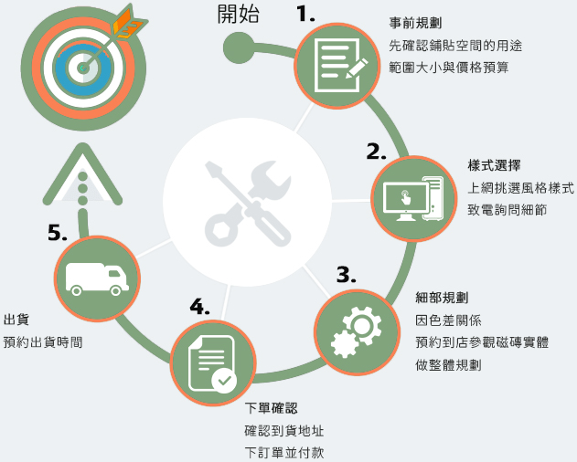 找尺寸 不知道如何選擇?不擔心,讓我們知道尺寸可以給您建議唷! 點擊這裡 找顏色 因為磁磚種類顏色琳瑯滿目,又五花八門不知道如何選擇?快進來了解吧~ 點擊這裡 找空間 各種不同空間大小,該如何選擇磁磚搭配,才能達到所想要的樣子呢? 點擊這裡 找風格 喜歡獨特風格,不想跟別人撞”磚”? 沒問題,來找我們吧! 點擊這裡 最新消息 服務流程 服務流程 一對一諮詢 Opt-inΔ名字電話電子信箱 預約日期諮詢項目- 選擇-磁磚衛浴燈具裝修繼續下一步
